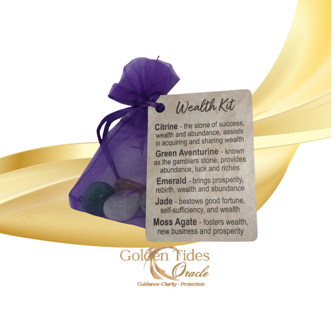 In this kit you get a small drawstring bag with 5 tumbled crystals that may help you on your wealth journey.